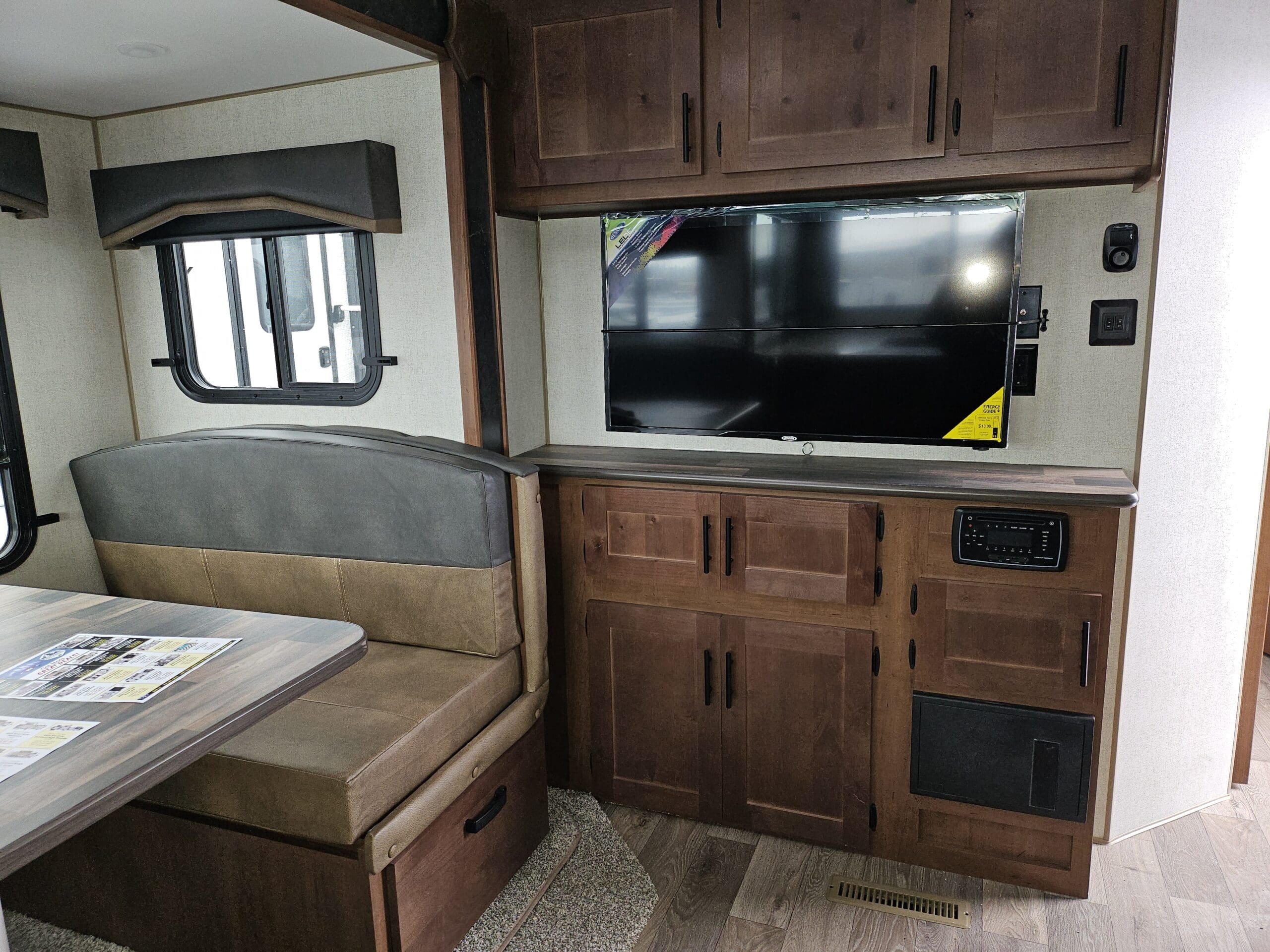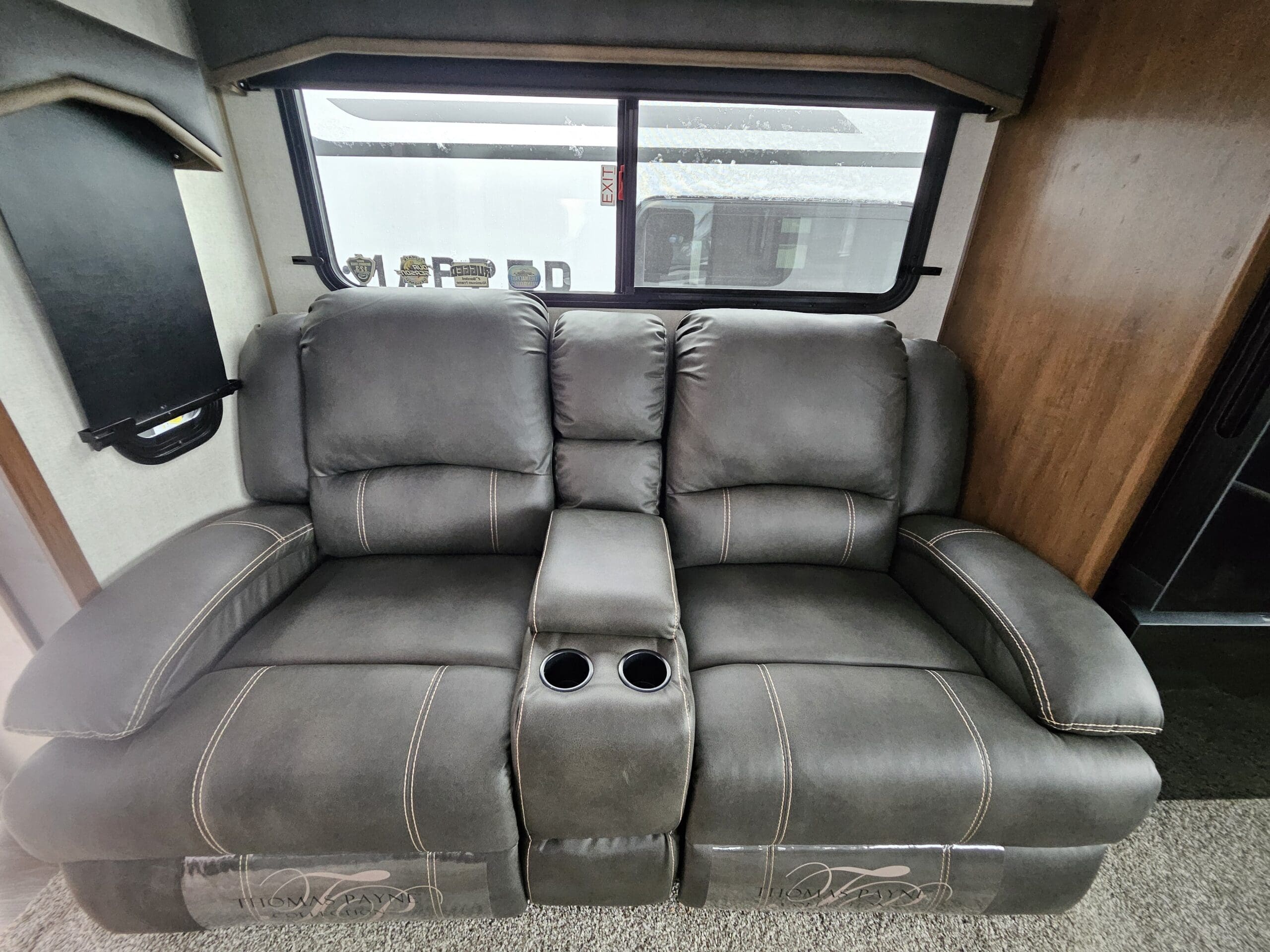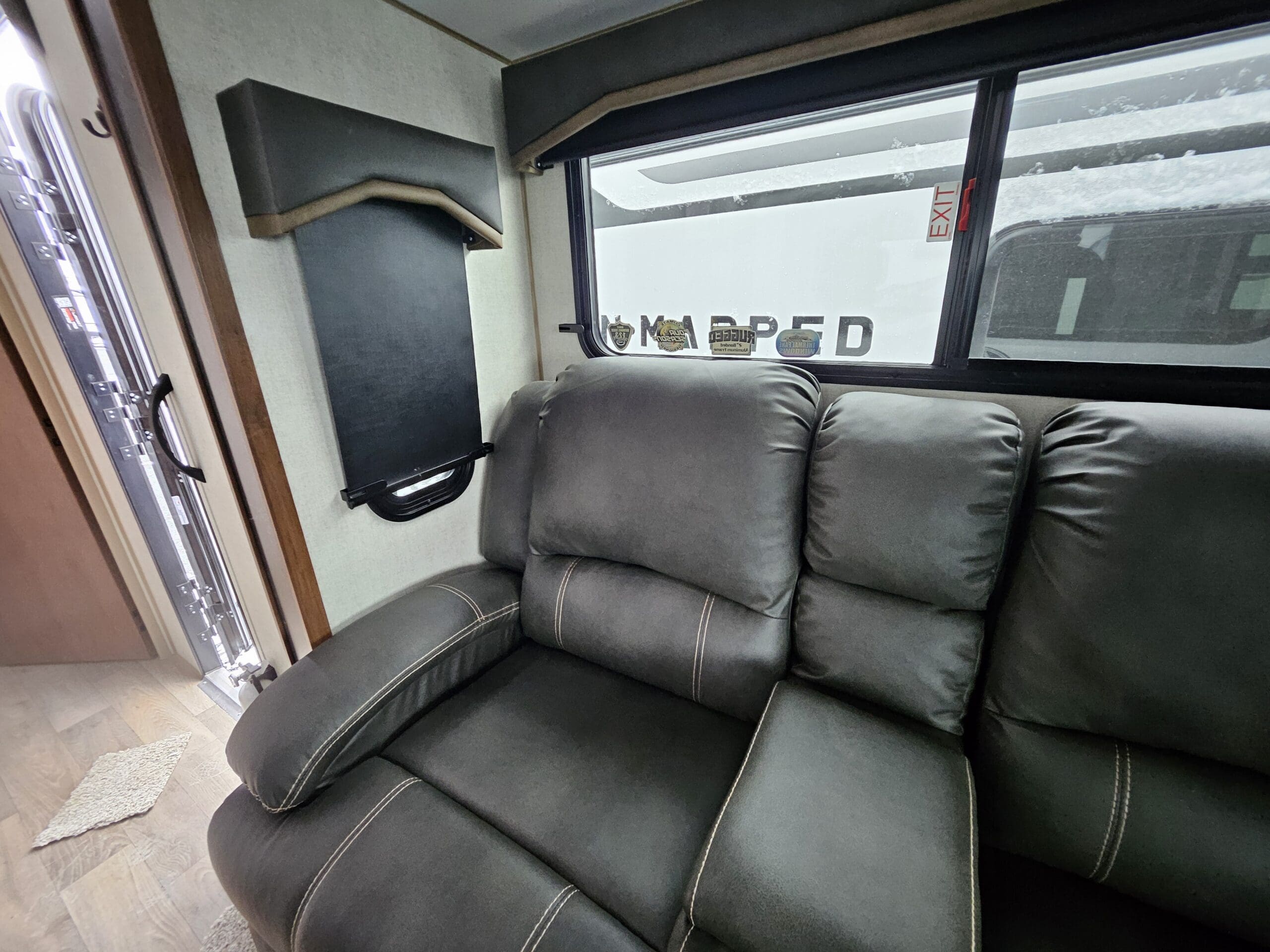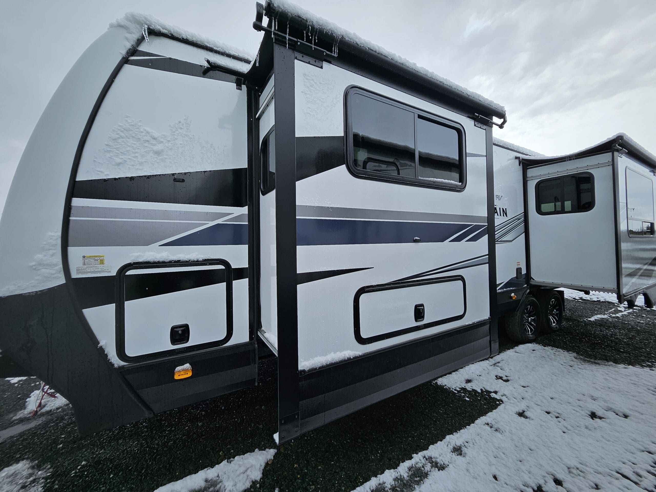 Opposing Slides: Creates a “great room” feel in the center of the trailer with theater seating/recliners facing a mountain dinette.