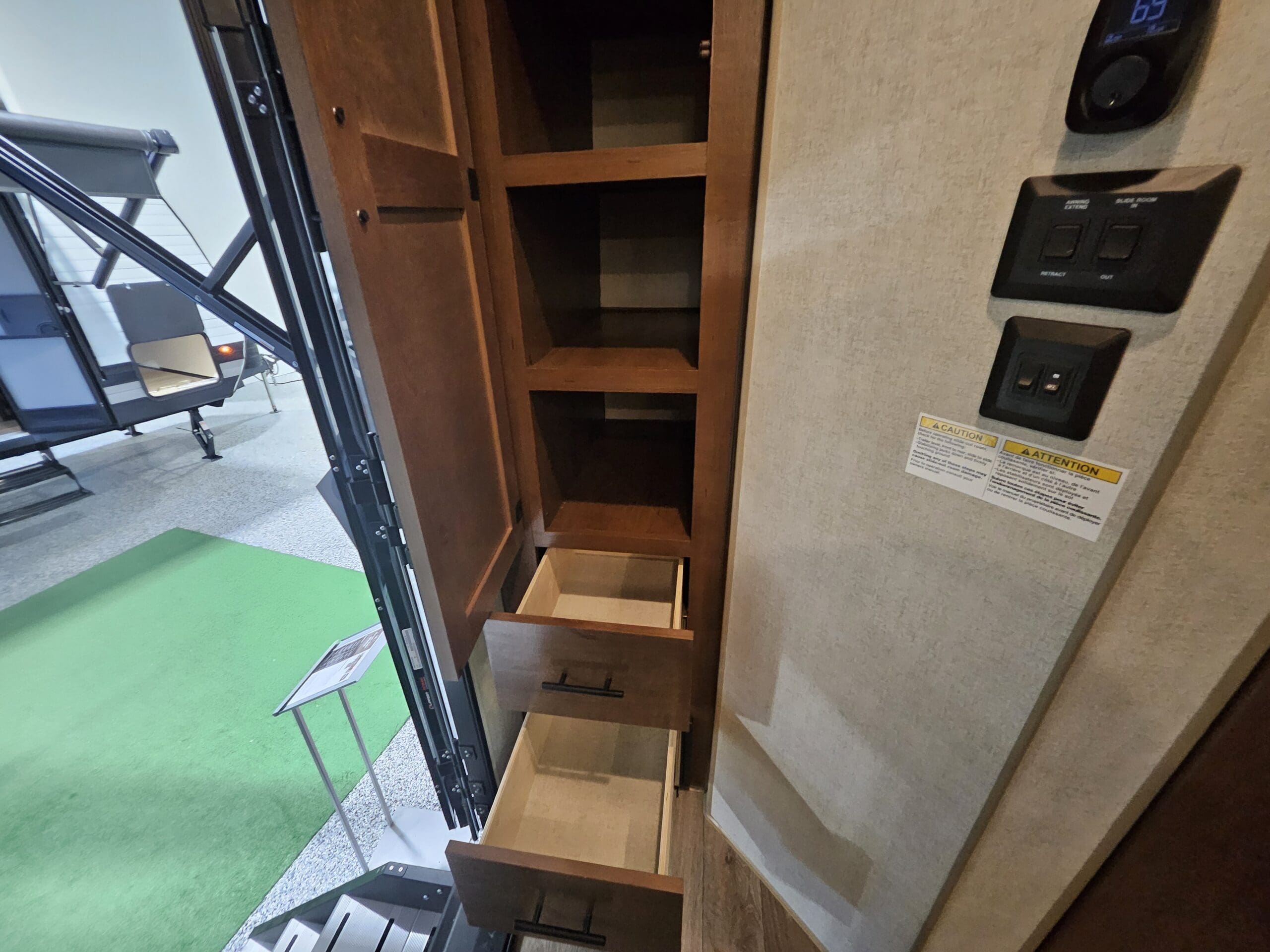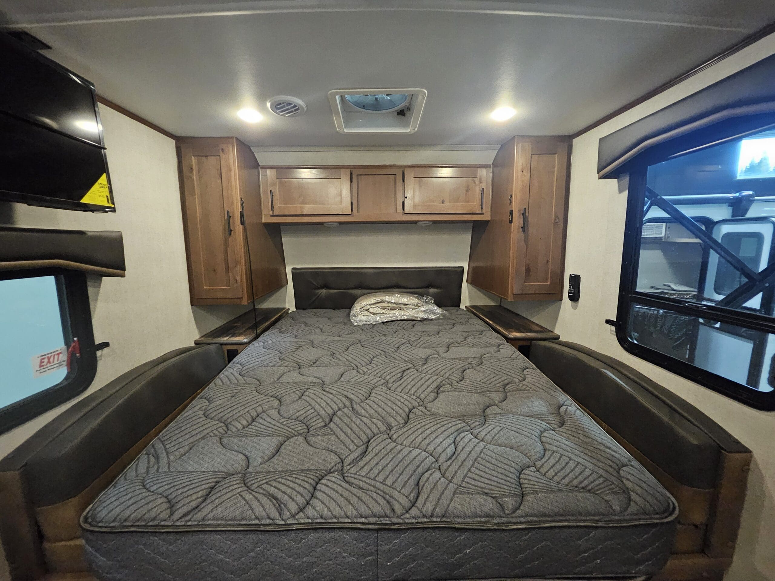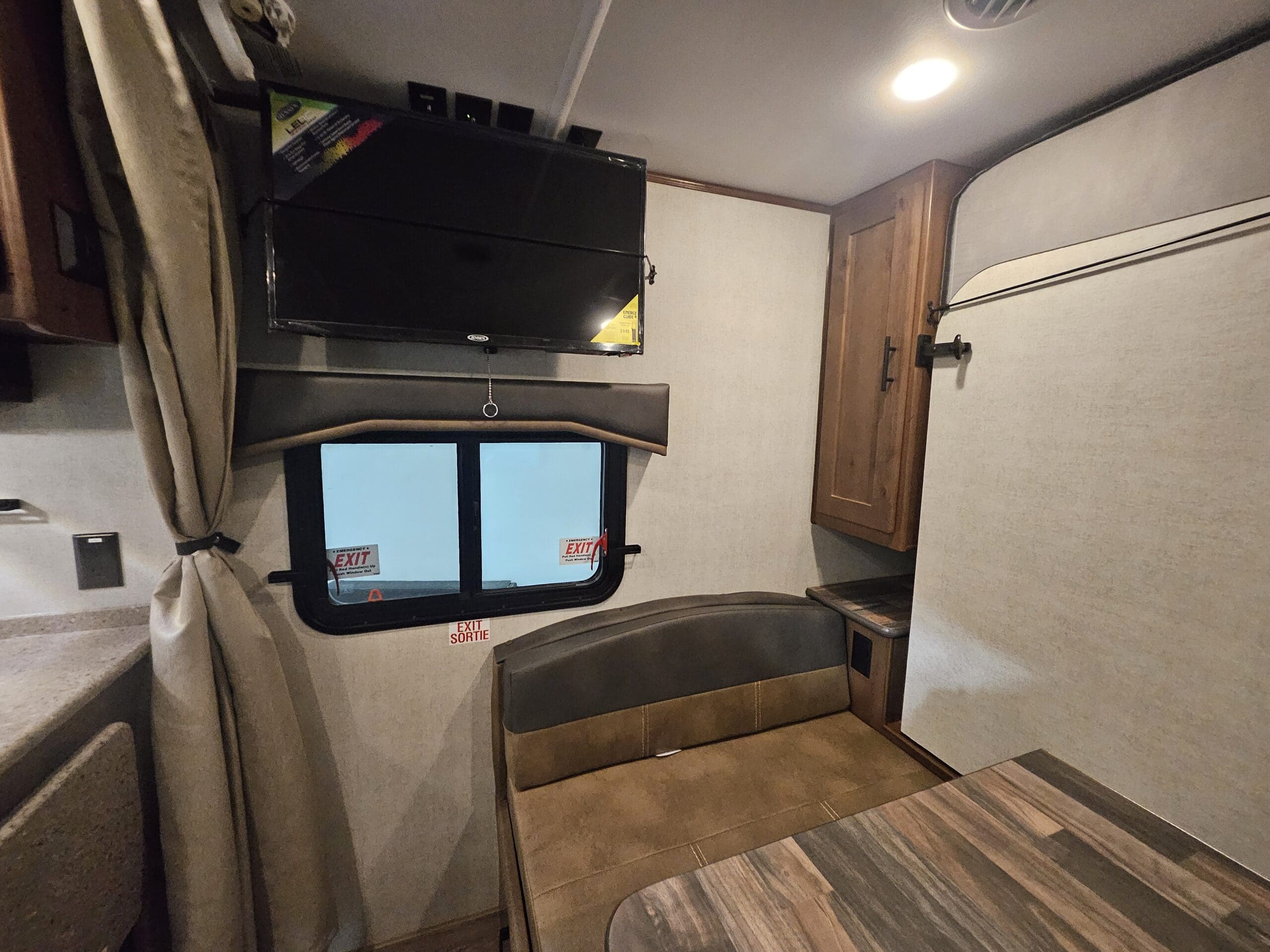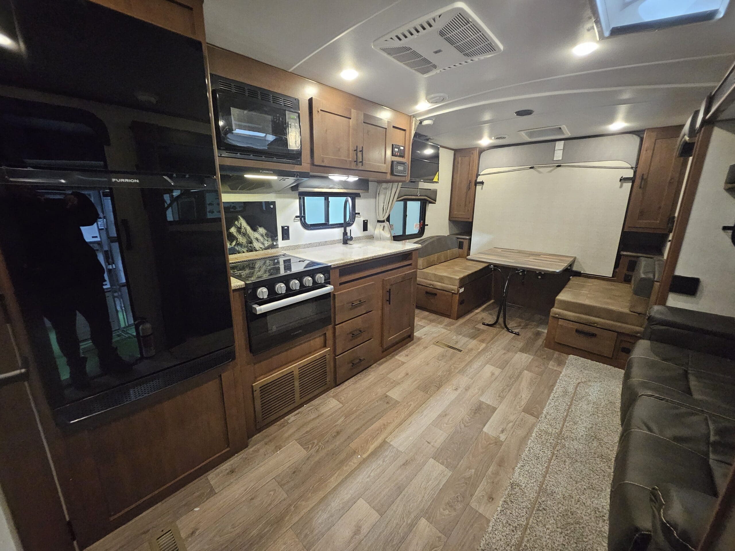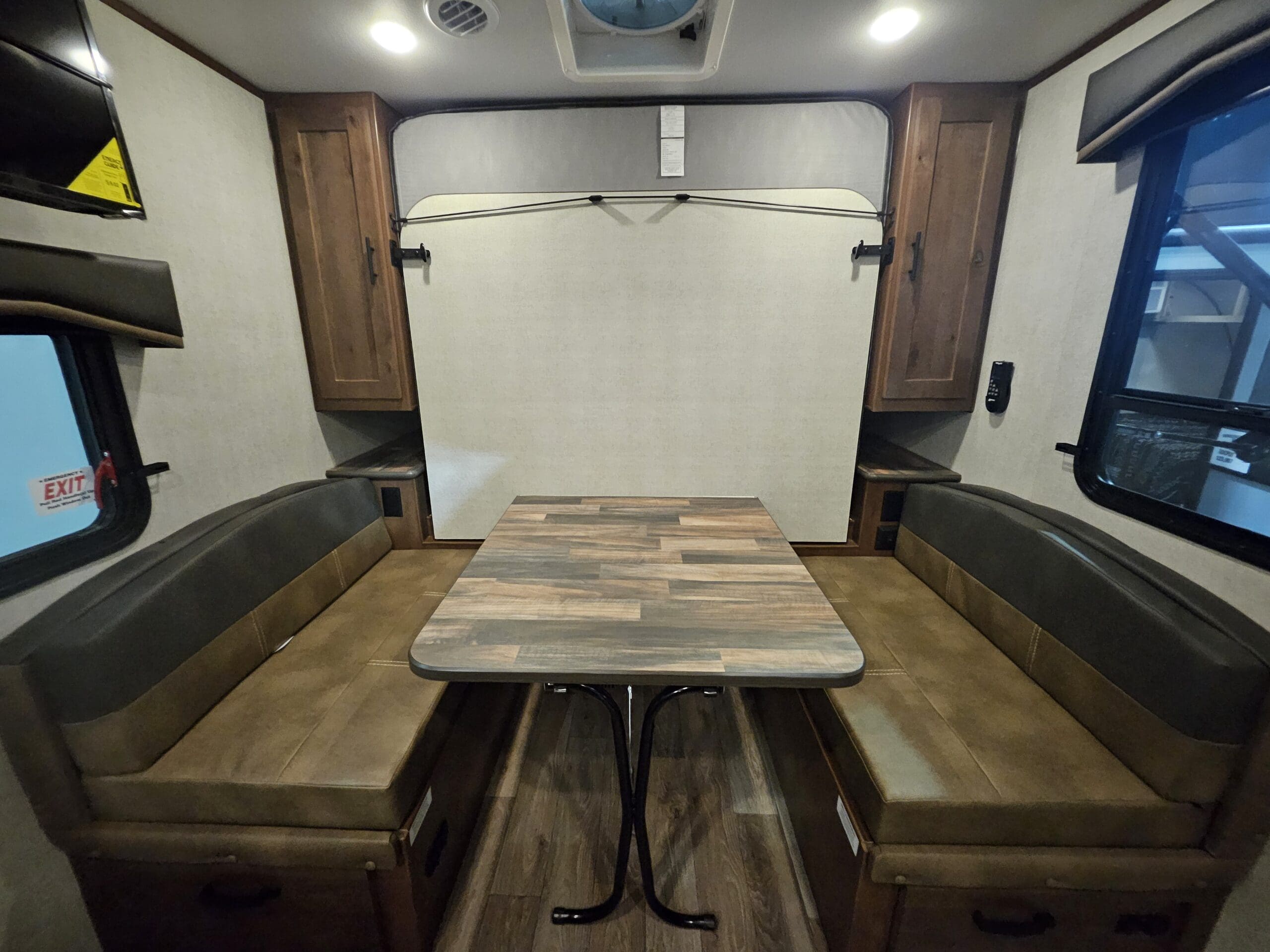 Murphy Bed Design: A 60″ x 80″ Queen Murphy bed folds down over the dinette area. This keeps the footprint small while providing a “real” bed experience.