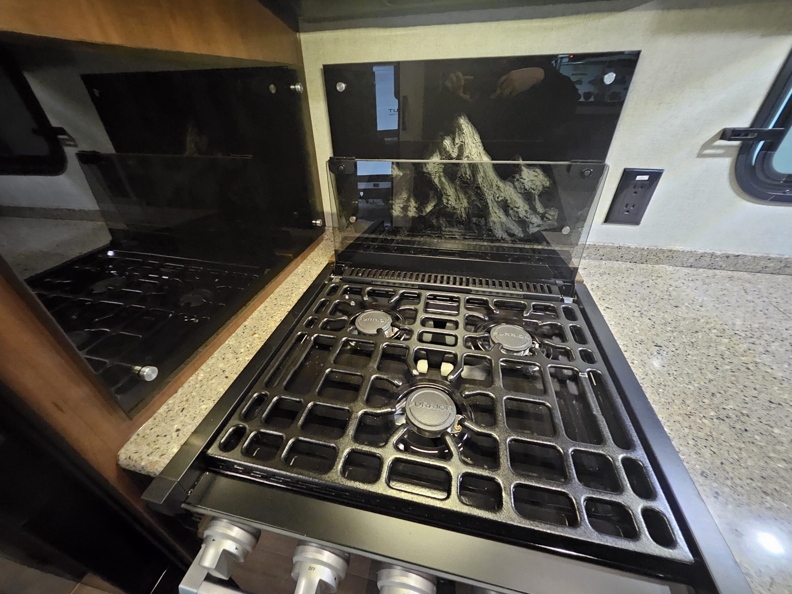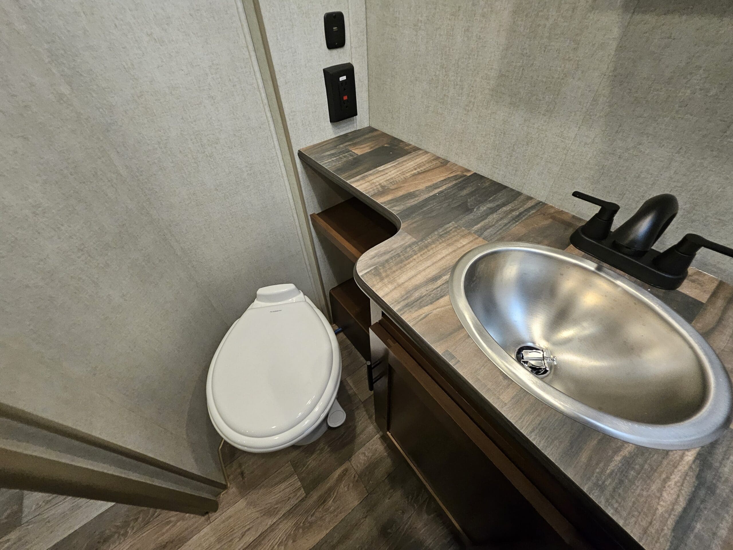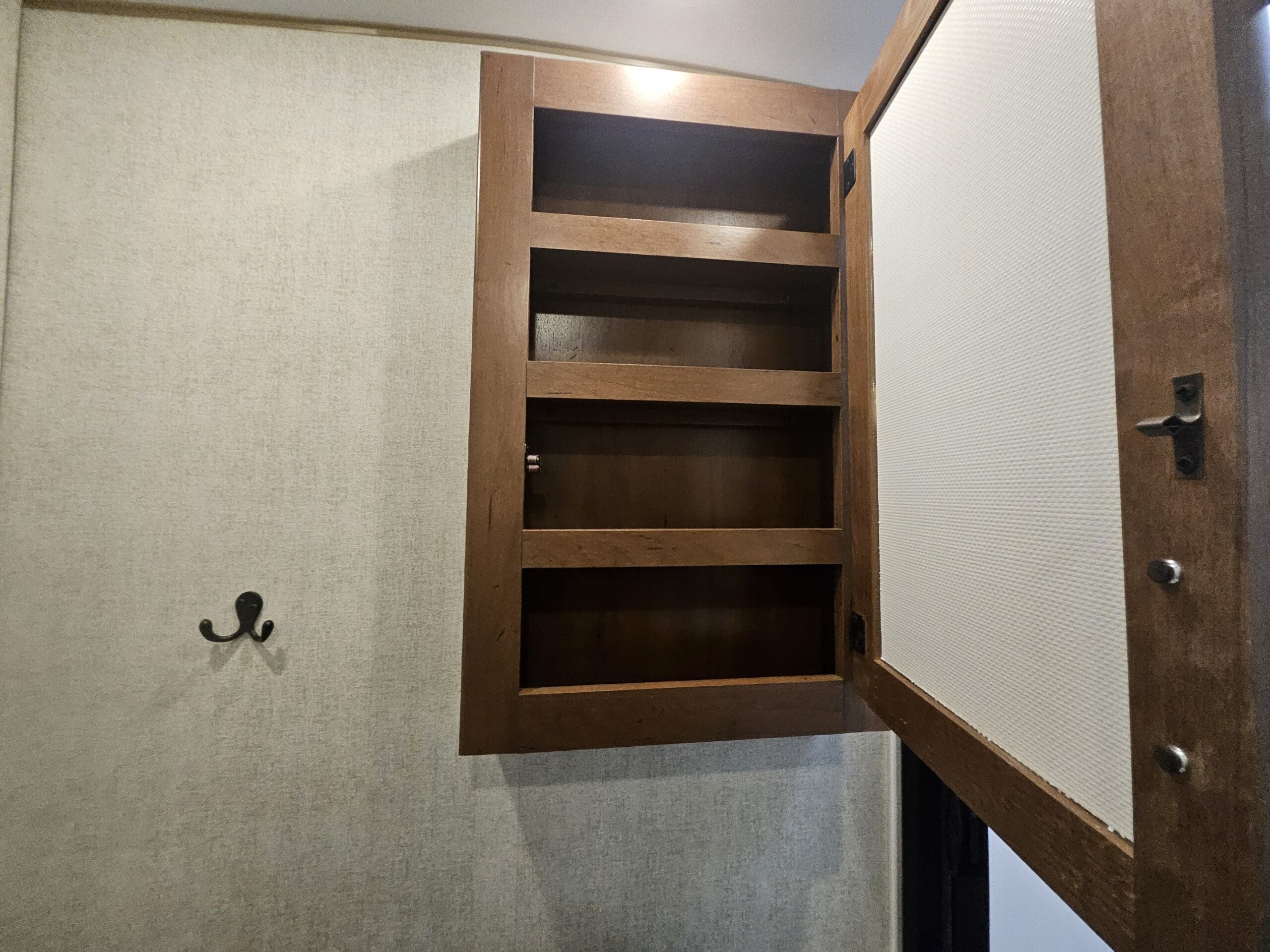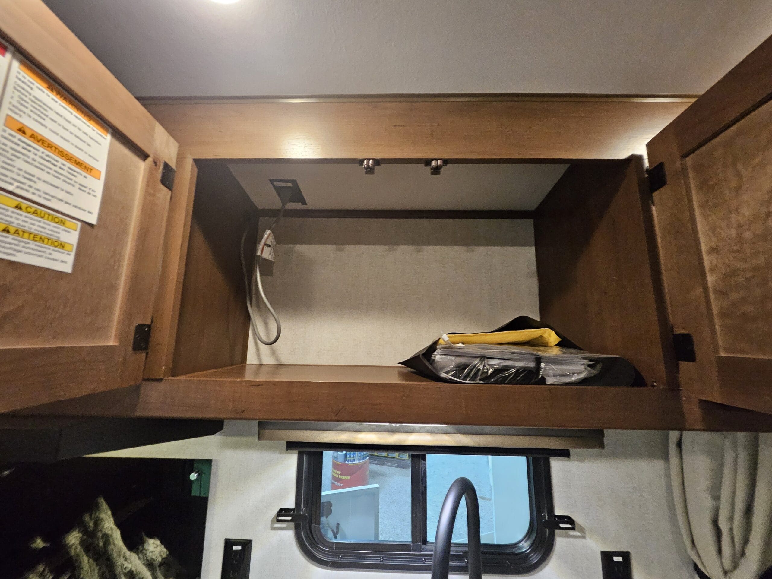 Murphy Bed Design: A 60″ x 80″ Queen Murphy bed folds down over the dinette area. This keeps the footprint small while providing a “real” bed experience.