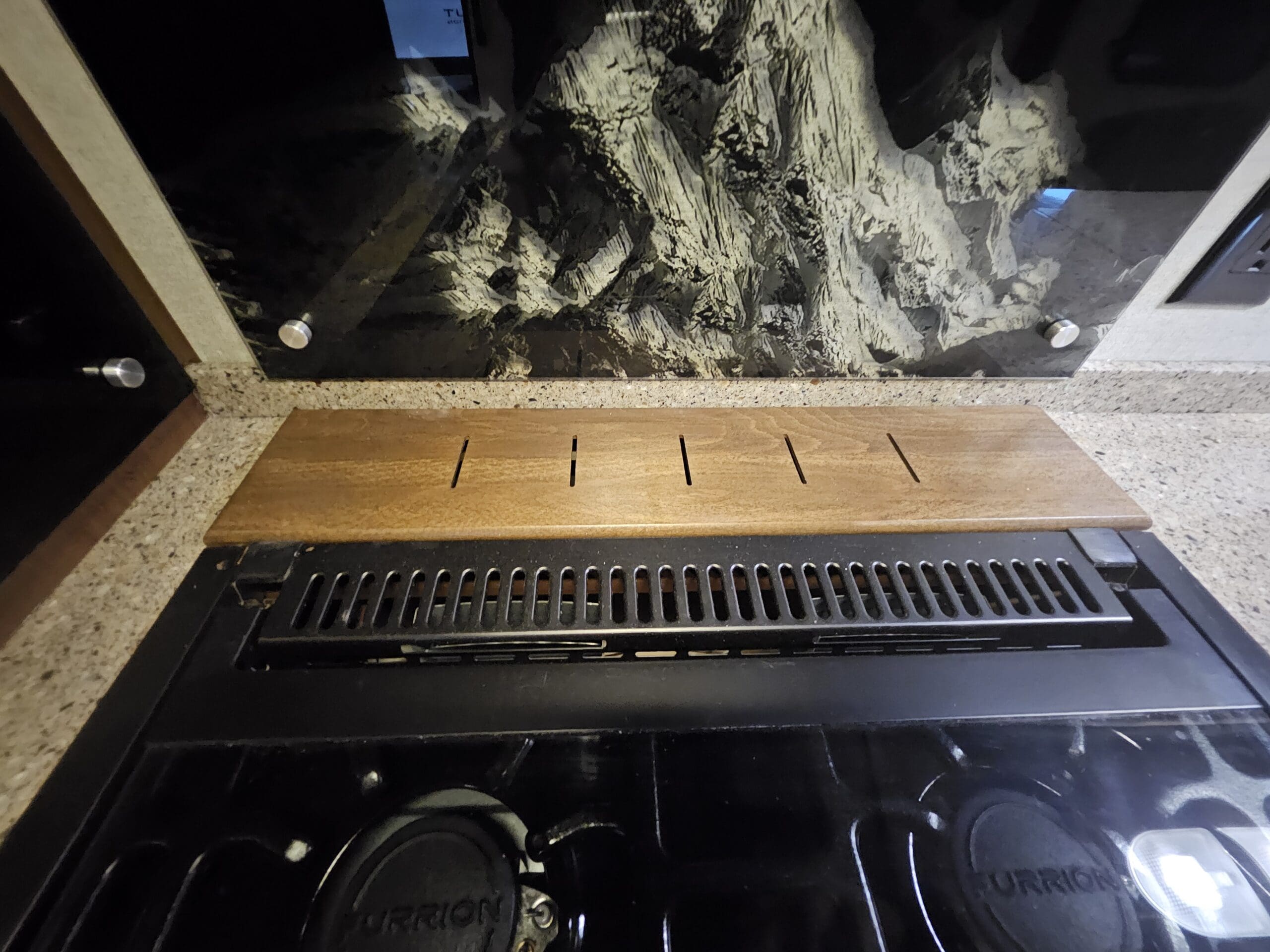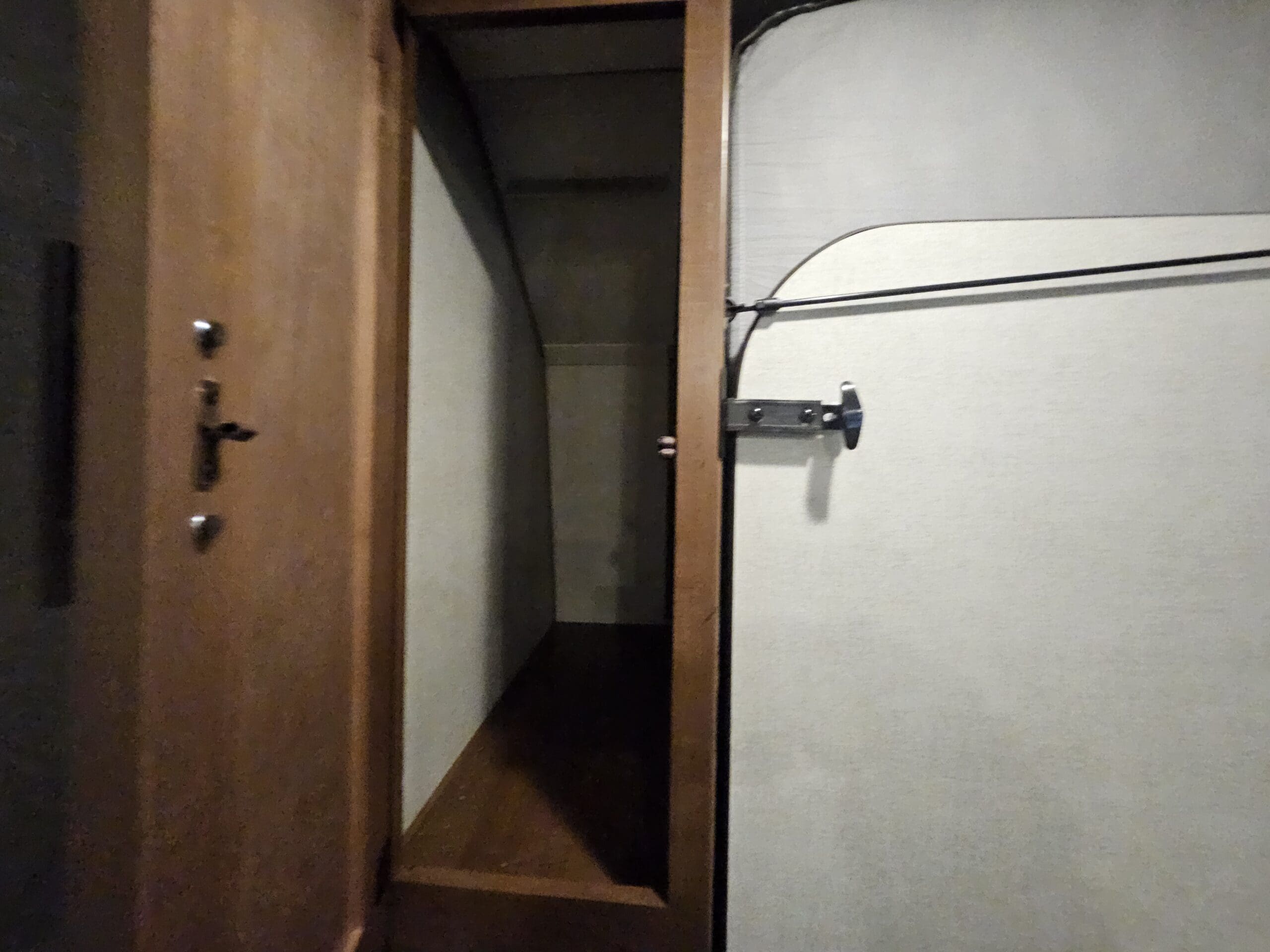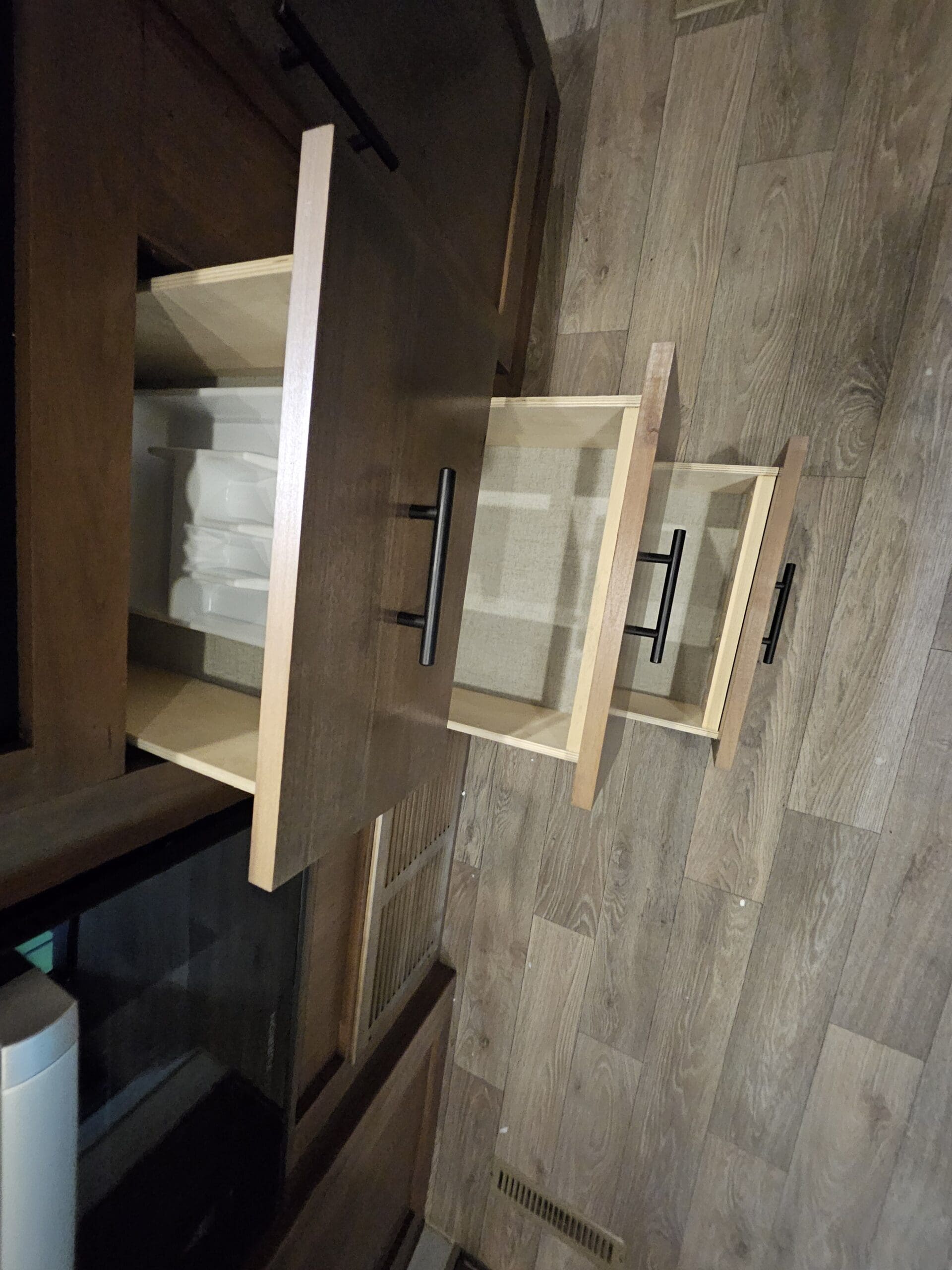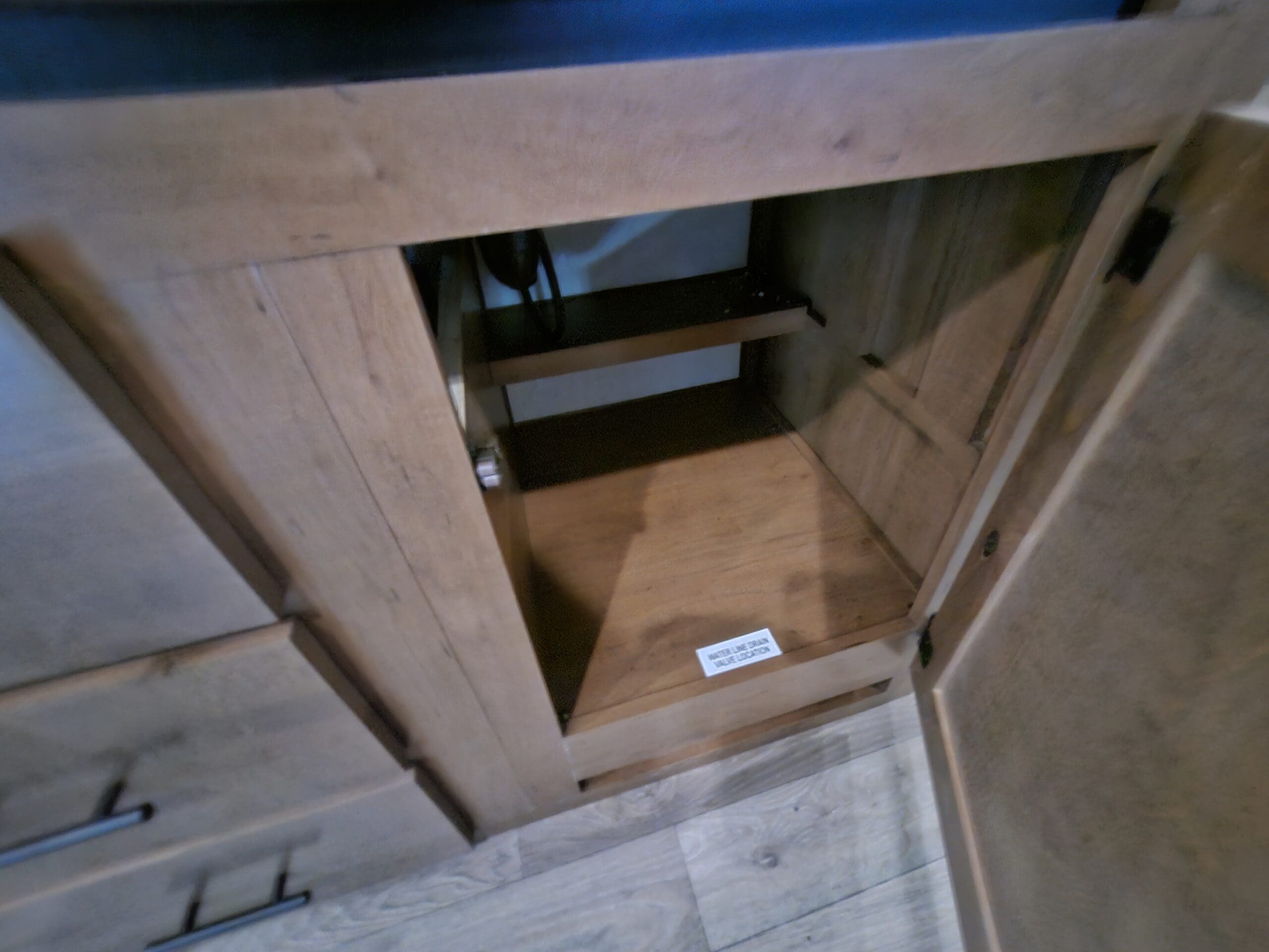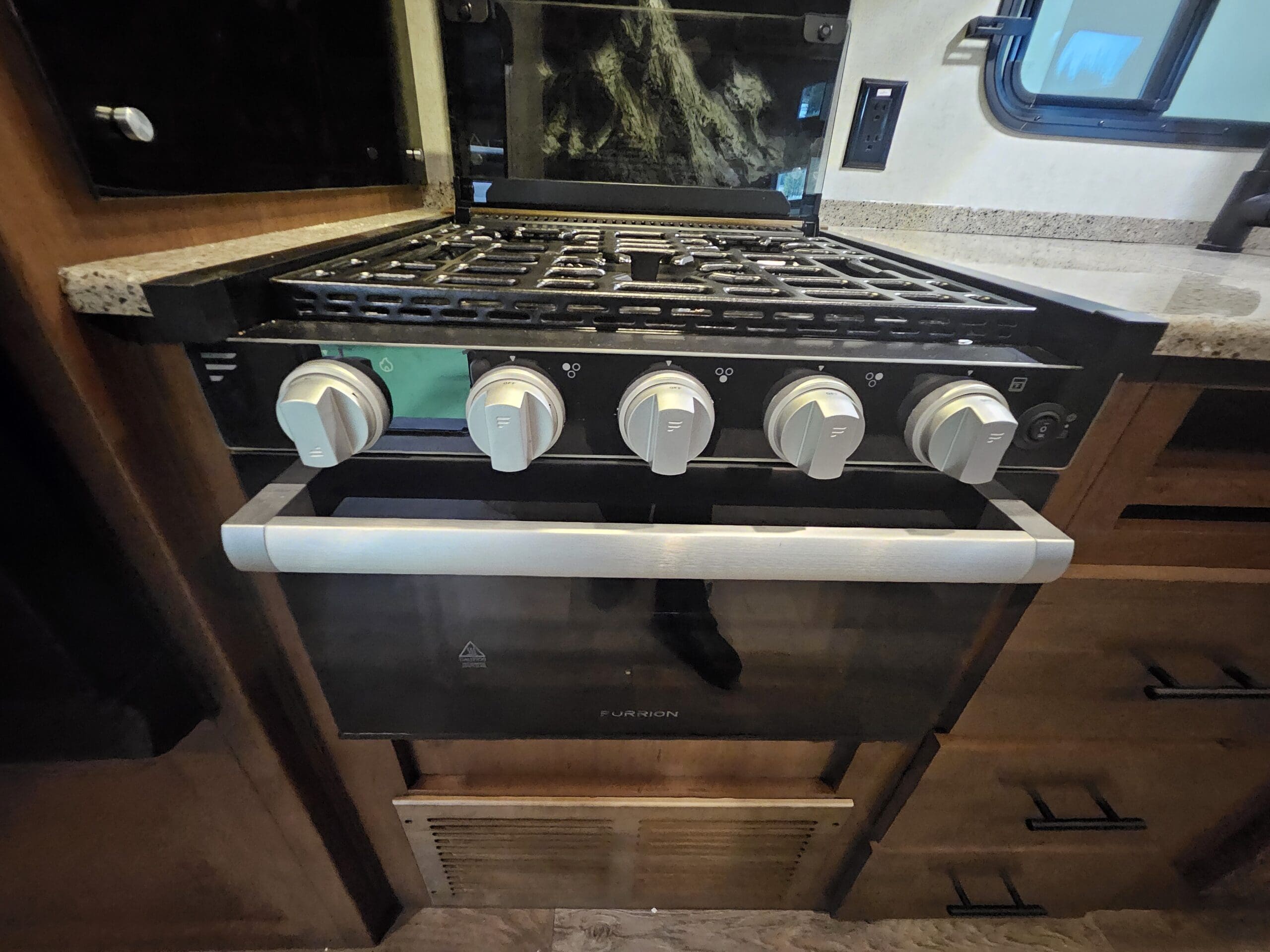 Murphy Bed Design: A 60″ x 80″ Queen Murphy bed folds down over the dinette area. This keeps the footprint small while providing a “real” bed experience.
