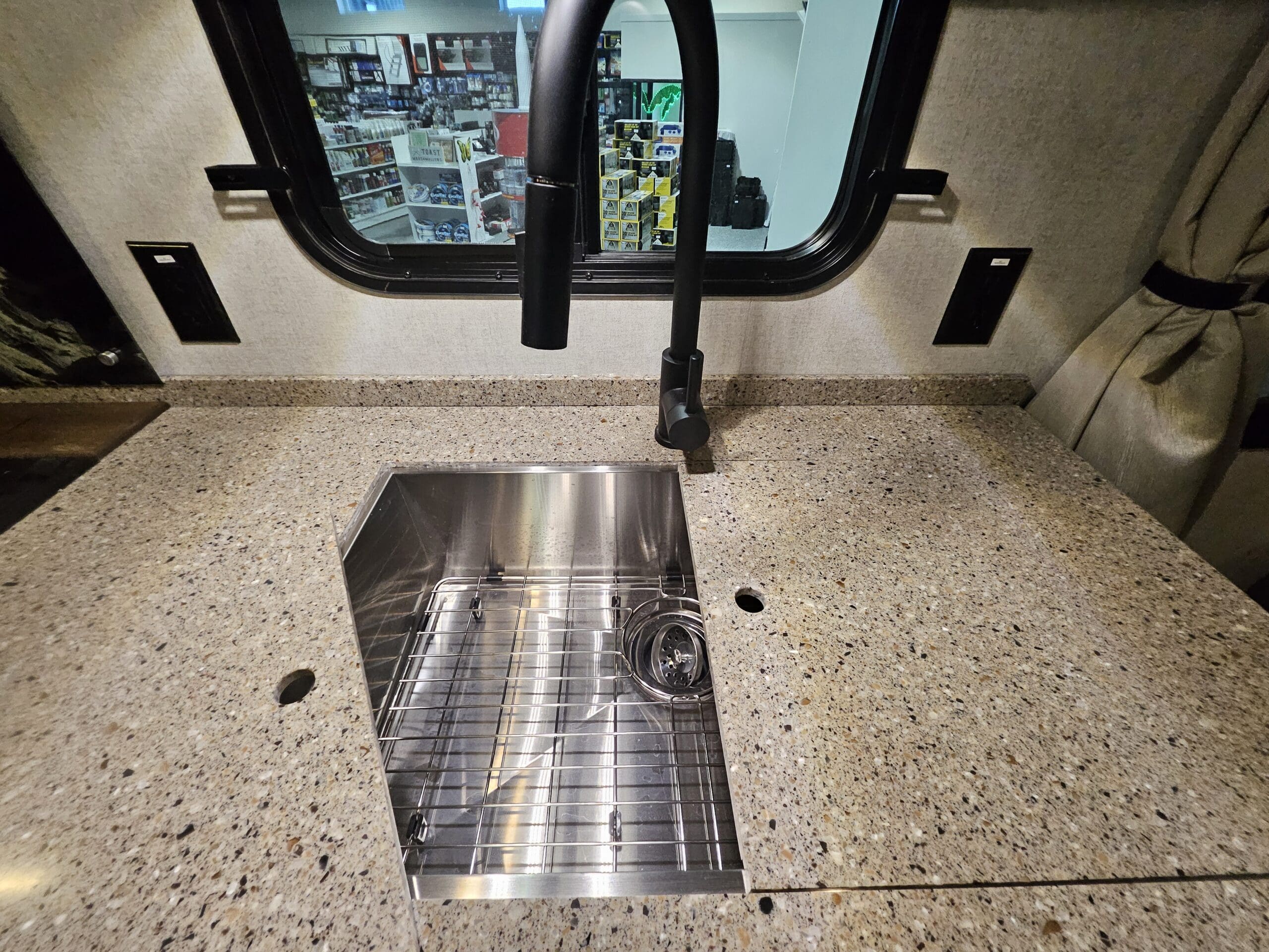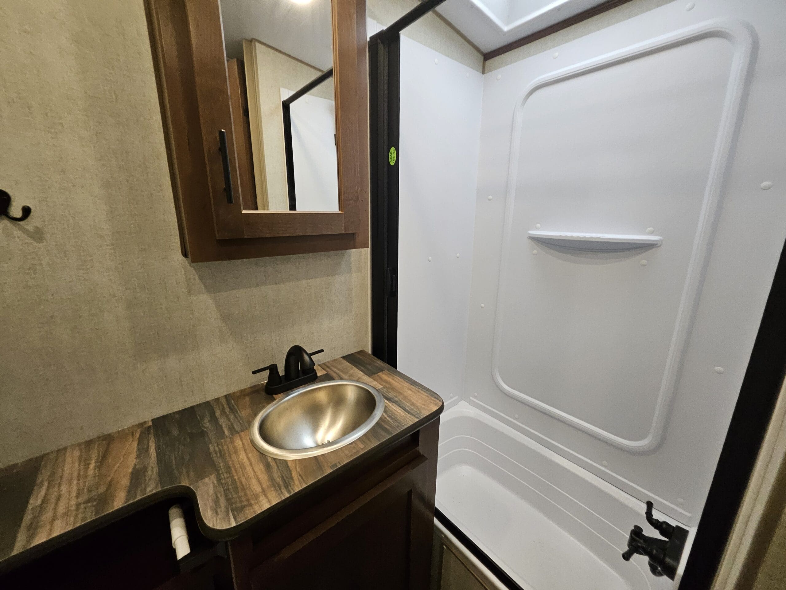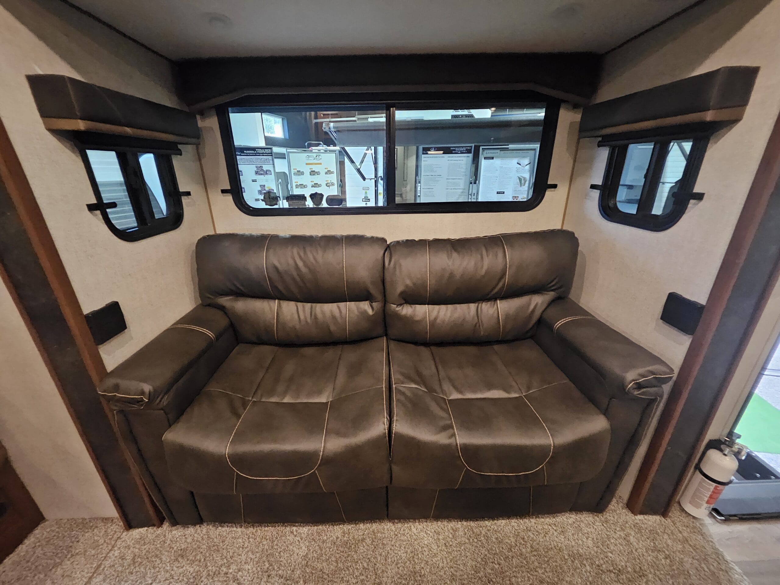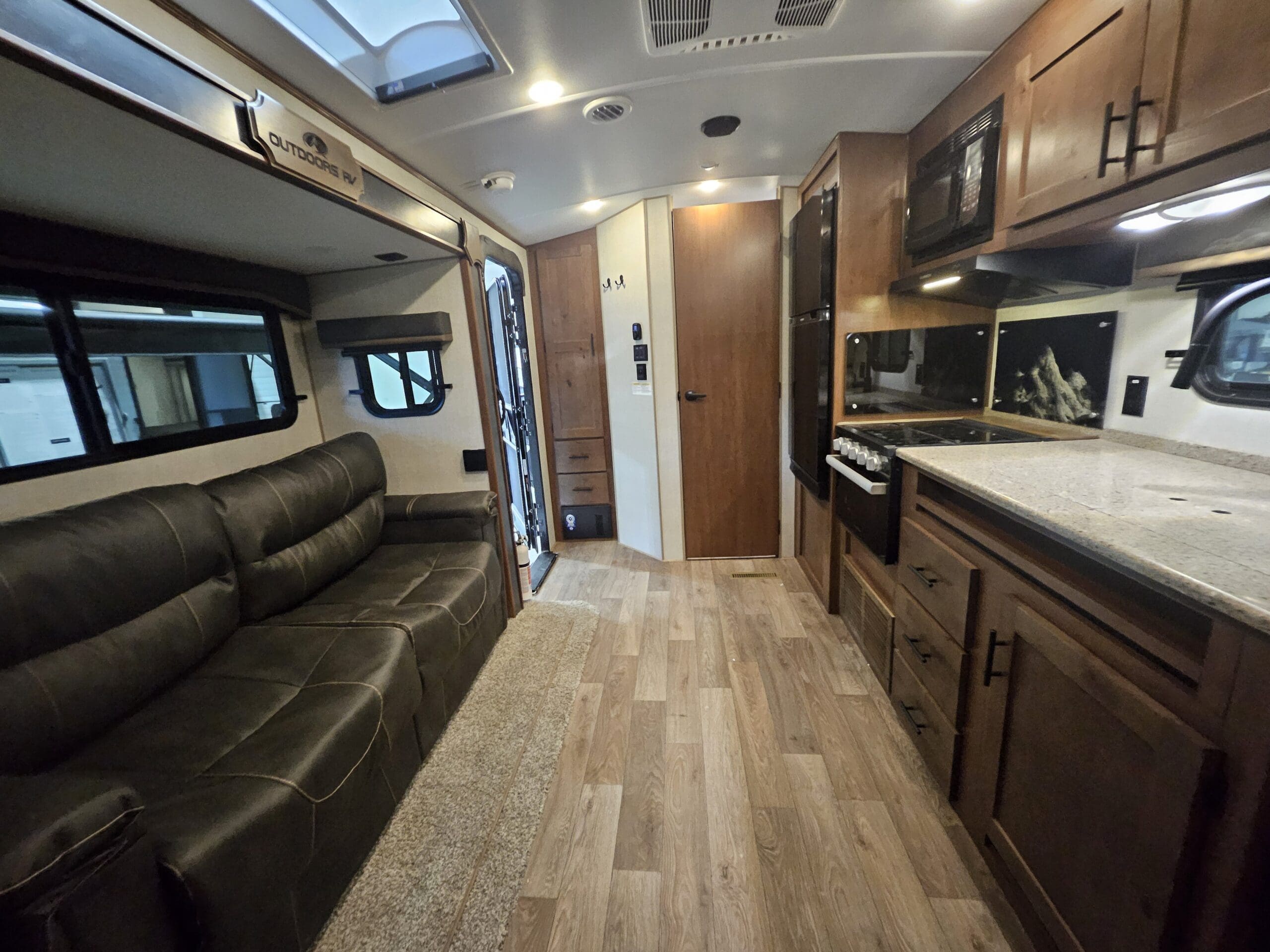 Slide-out Living: The single slide-out typically houses a residential sofa (with built-in recliners) or an optional sleeper sofa, significantly opening up the floor space.