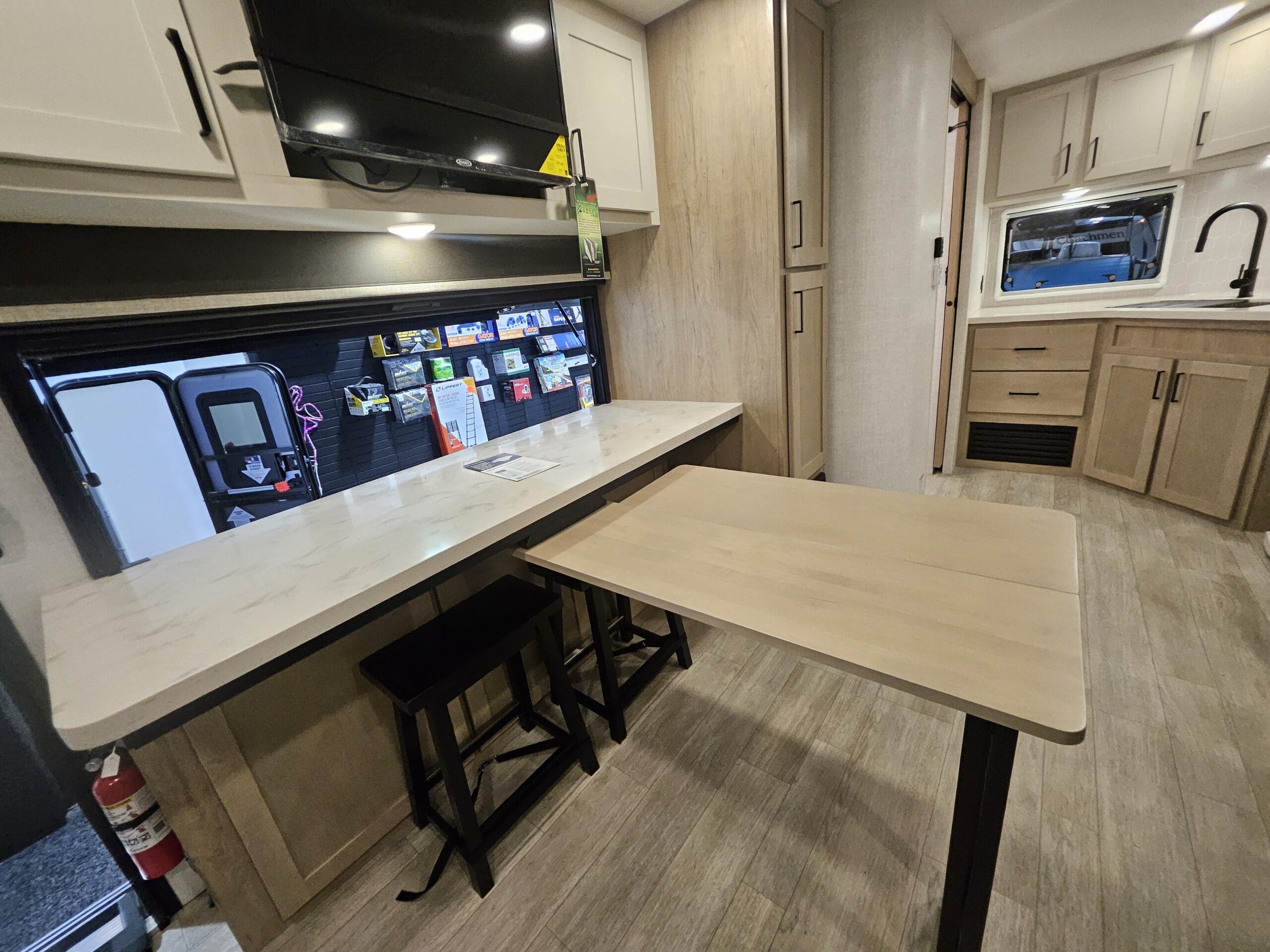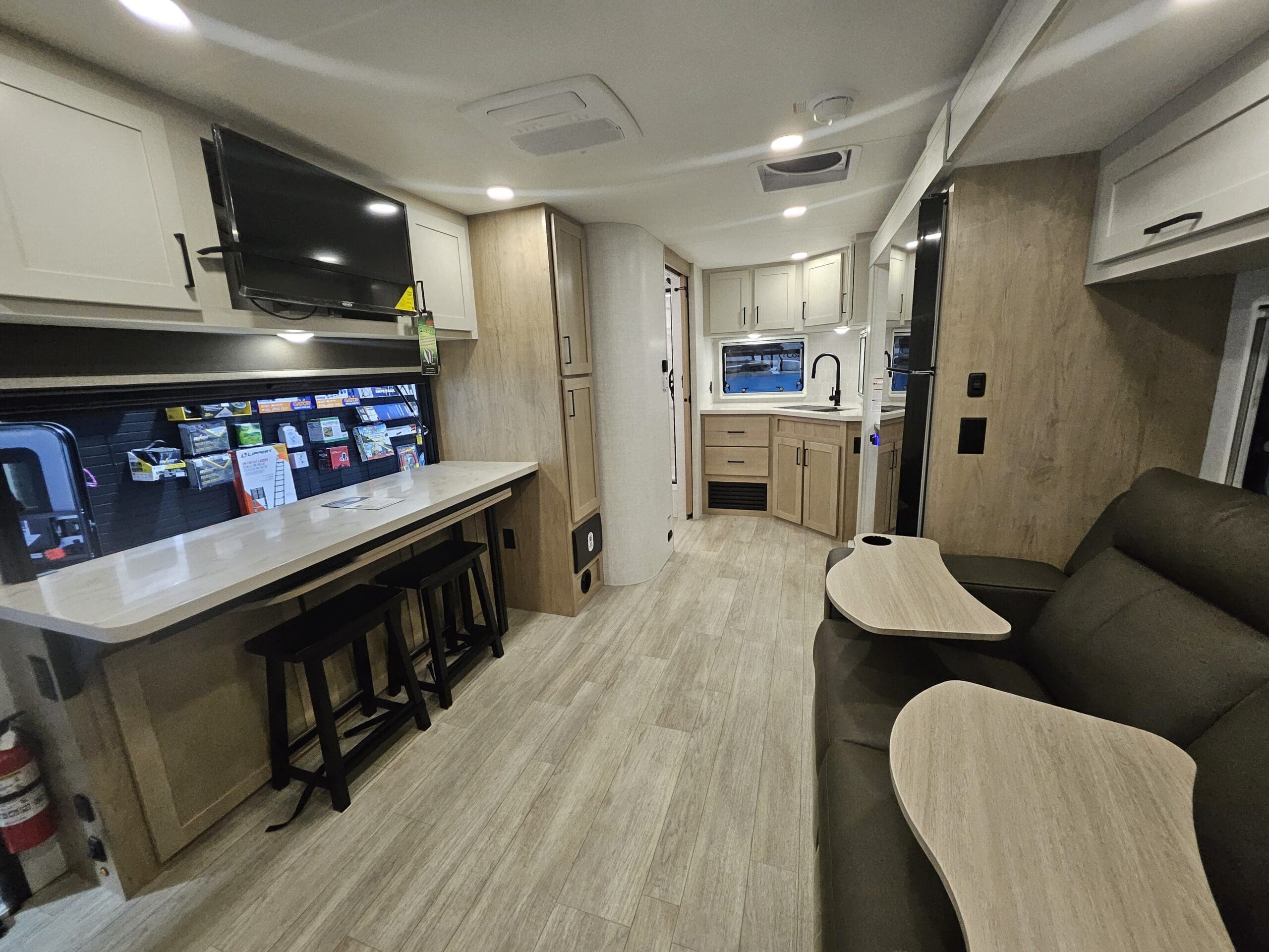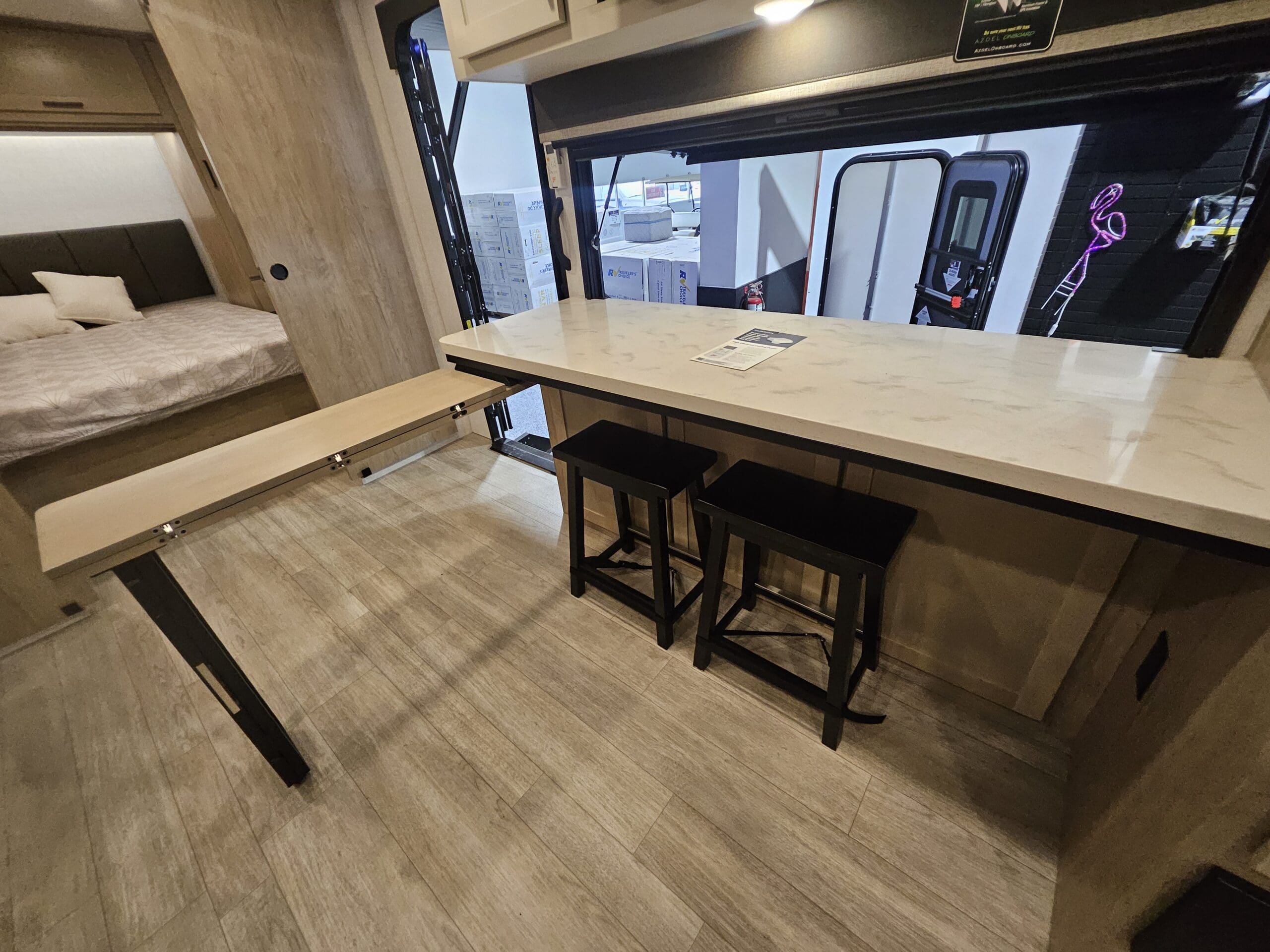 • The “Bar-V” Experience: The 2300MLL features a unique fold-up “Bar-V” window that connects the interior kitchen/bar area to the outdoors, perfect for entertaining at the campsite.