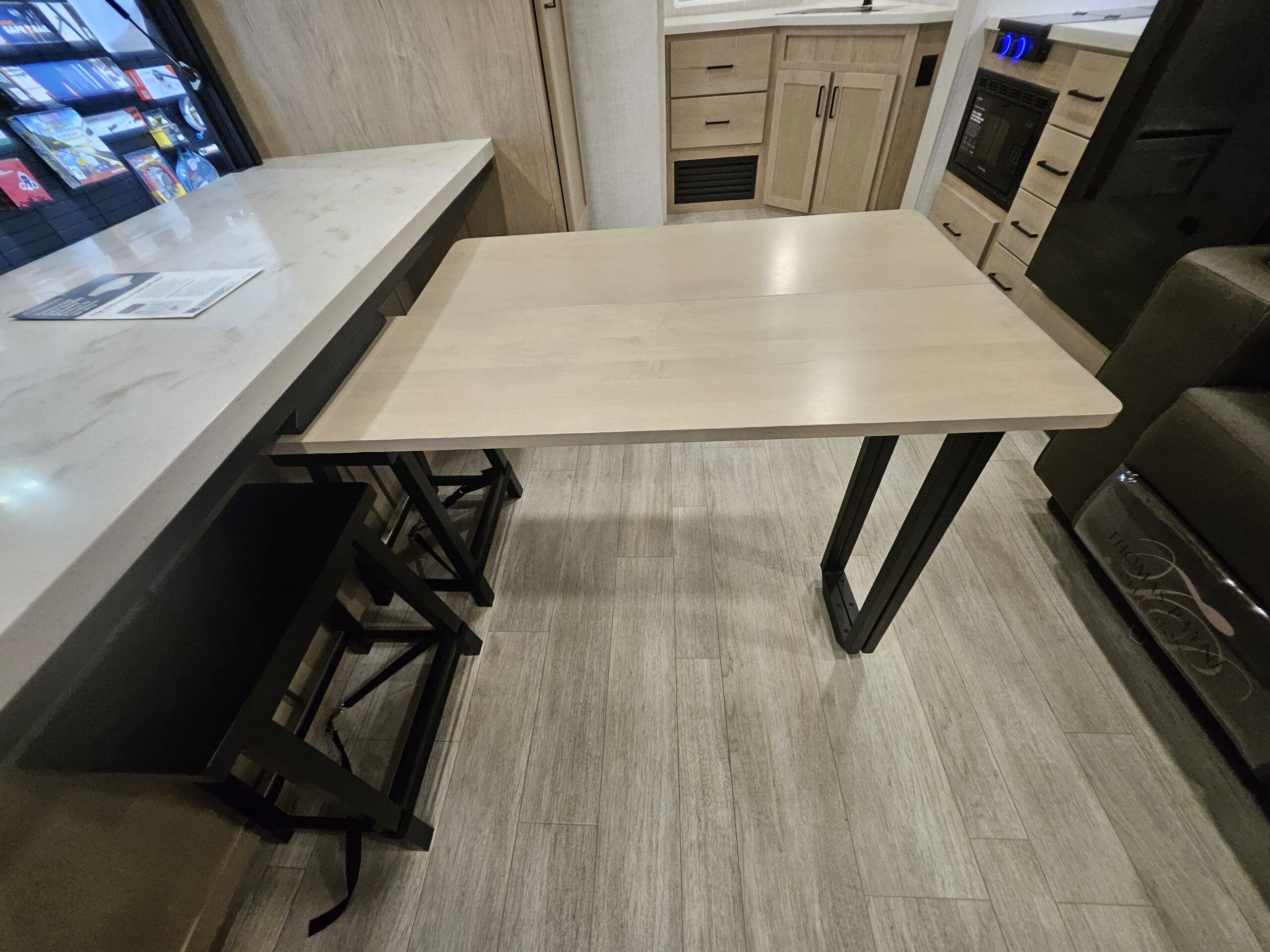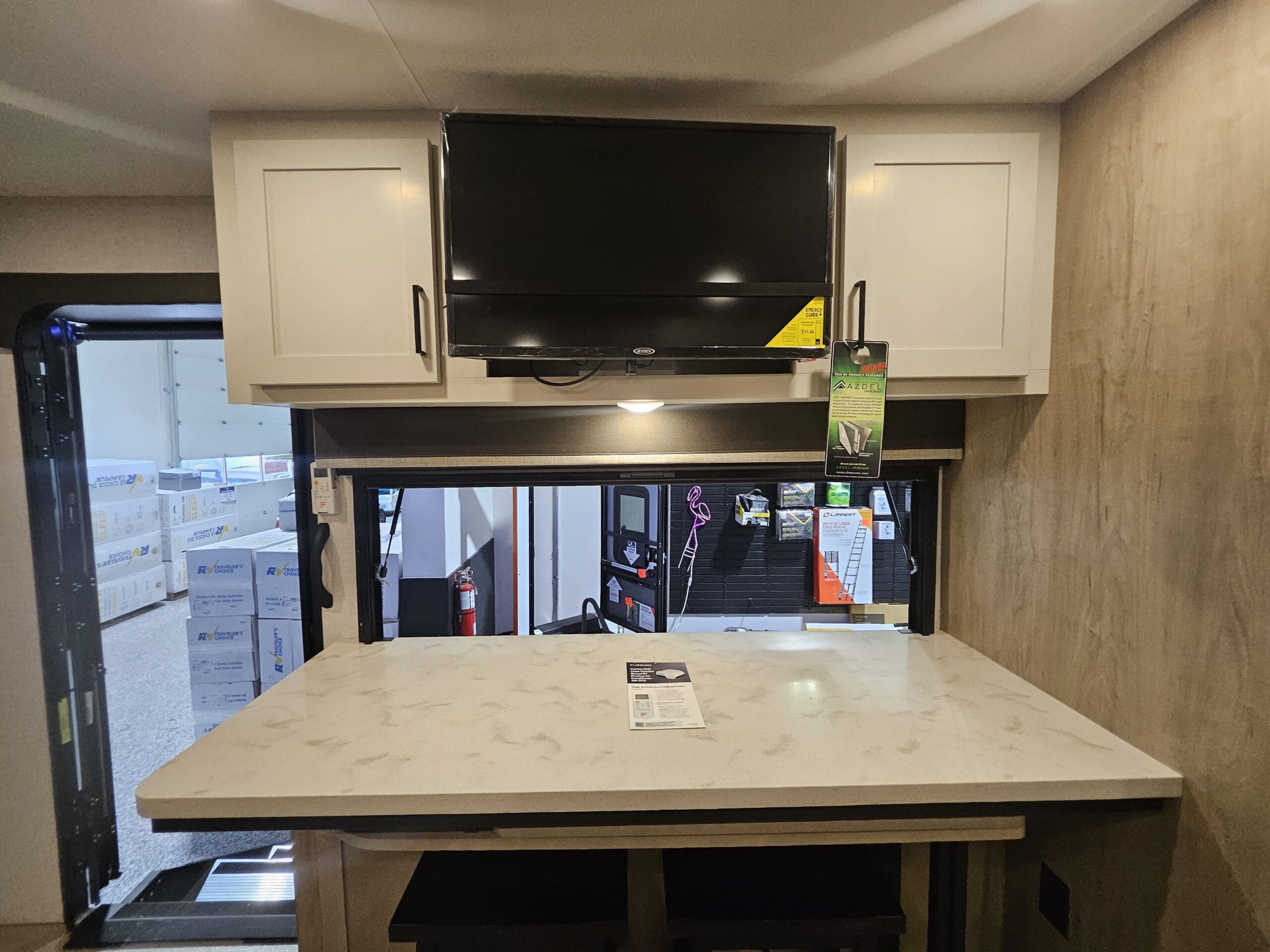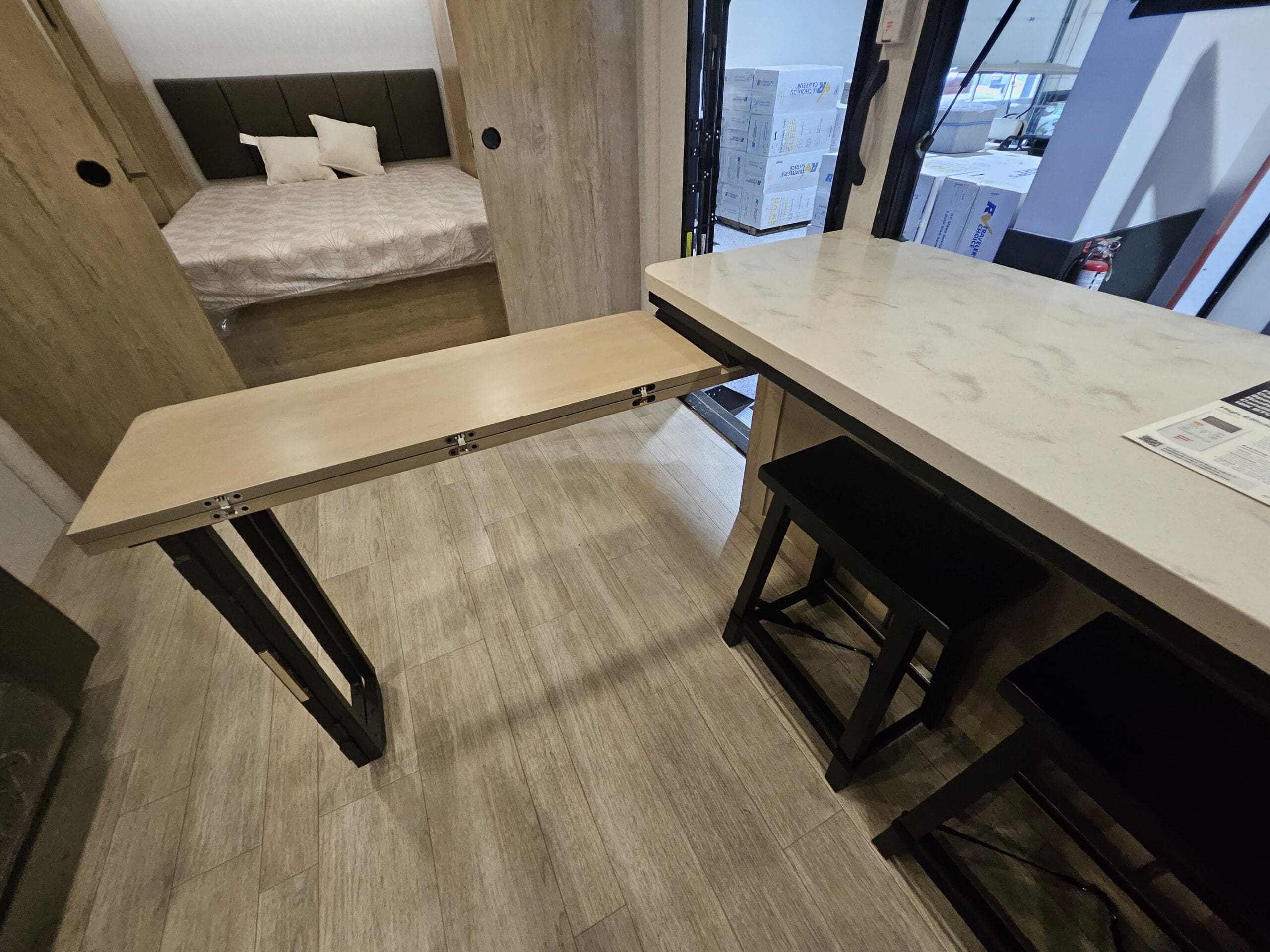 • The “Bar-V” Experience: The 2300MLL features a unique fold-up “Bar-V” window that connects the interior kitchen/bar area to the outdoors, perfect for entertaining at the campsite.