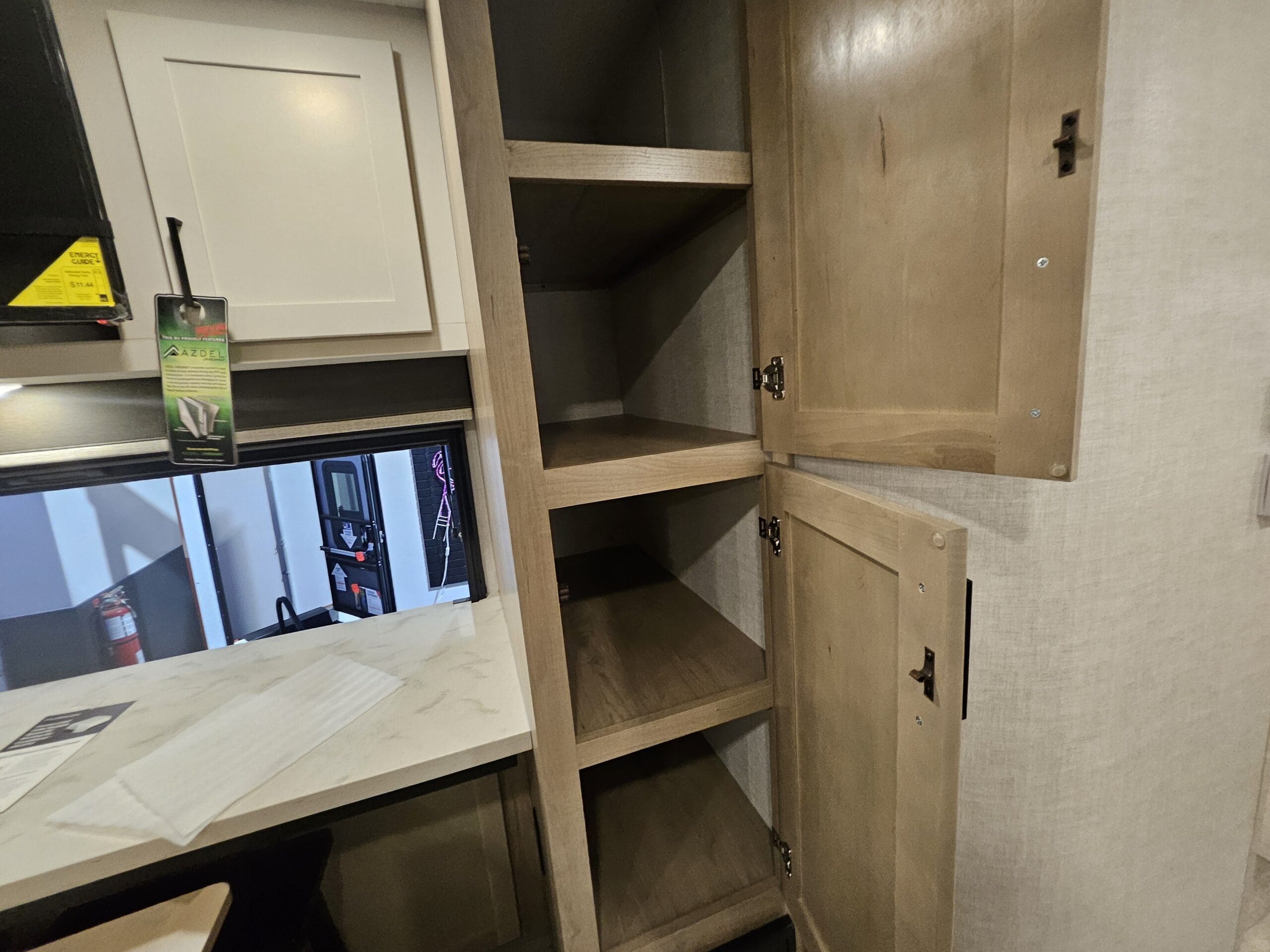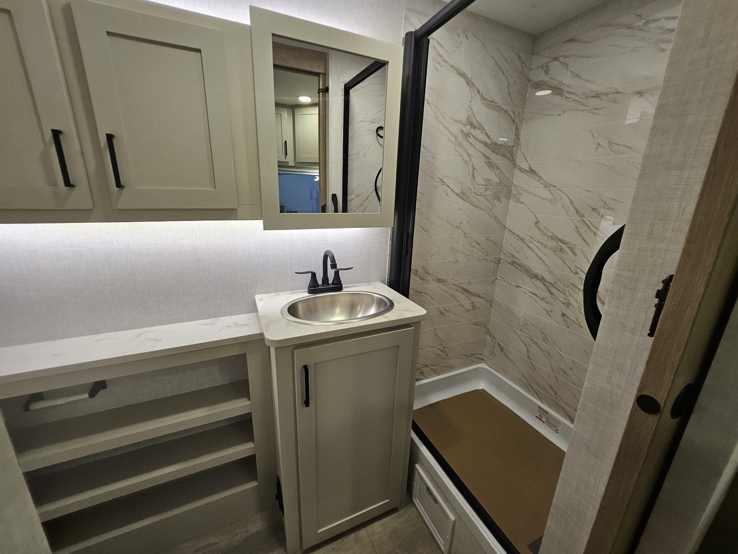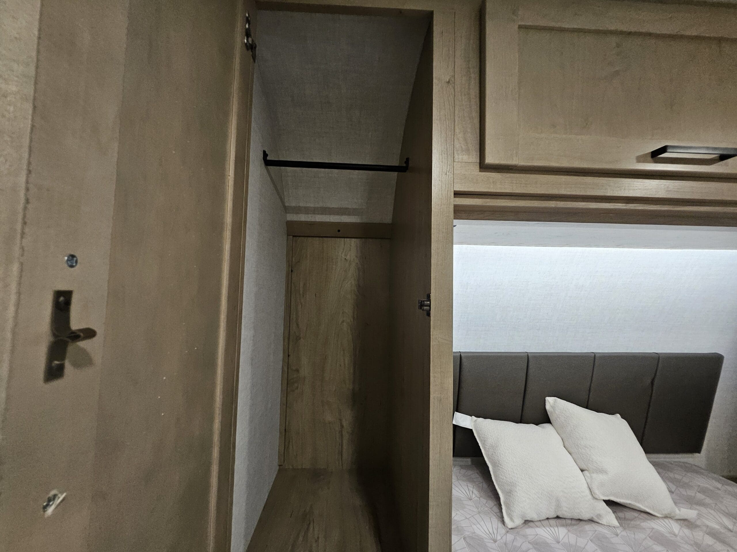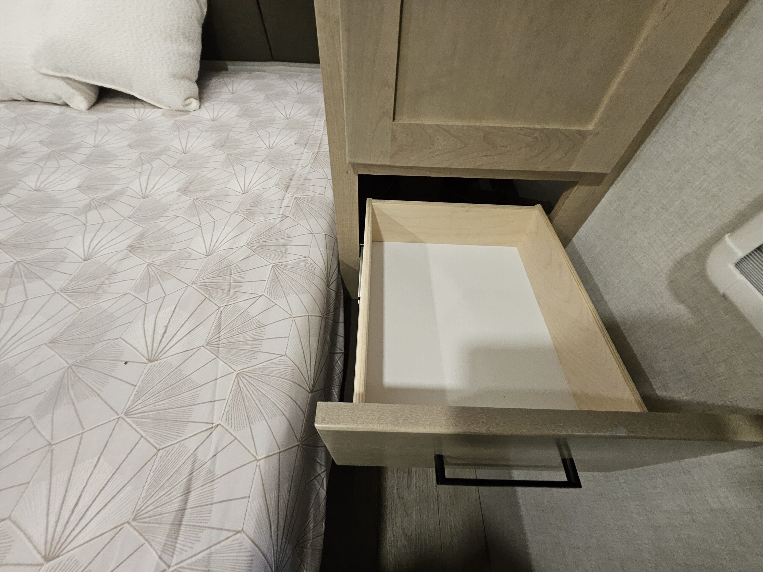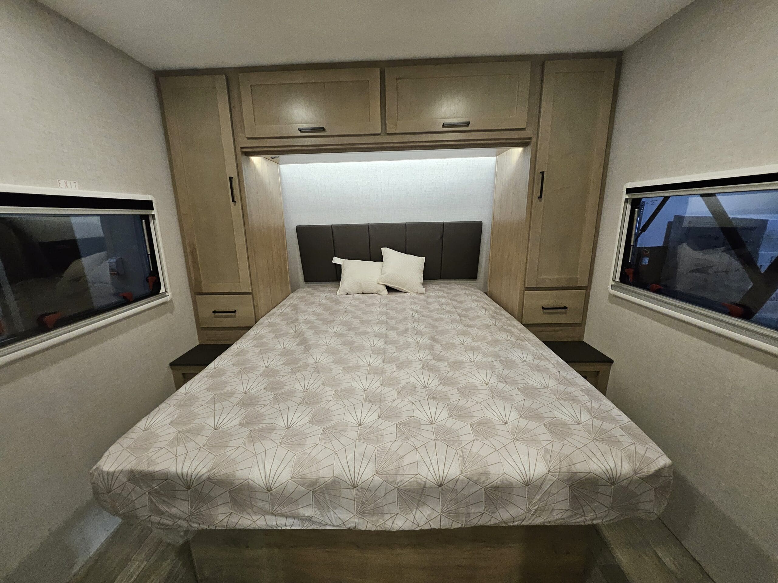 • True Residential Queen: Unlike many RVs that use “short” queens, this model features a 60″ x 80″ walk-around residential queen bed in a private front bedroom.